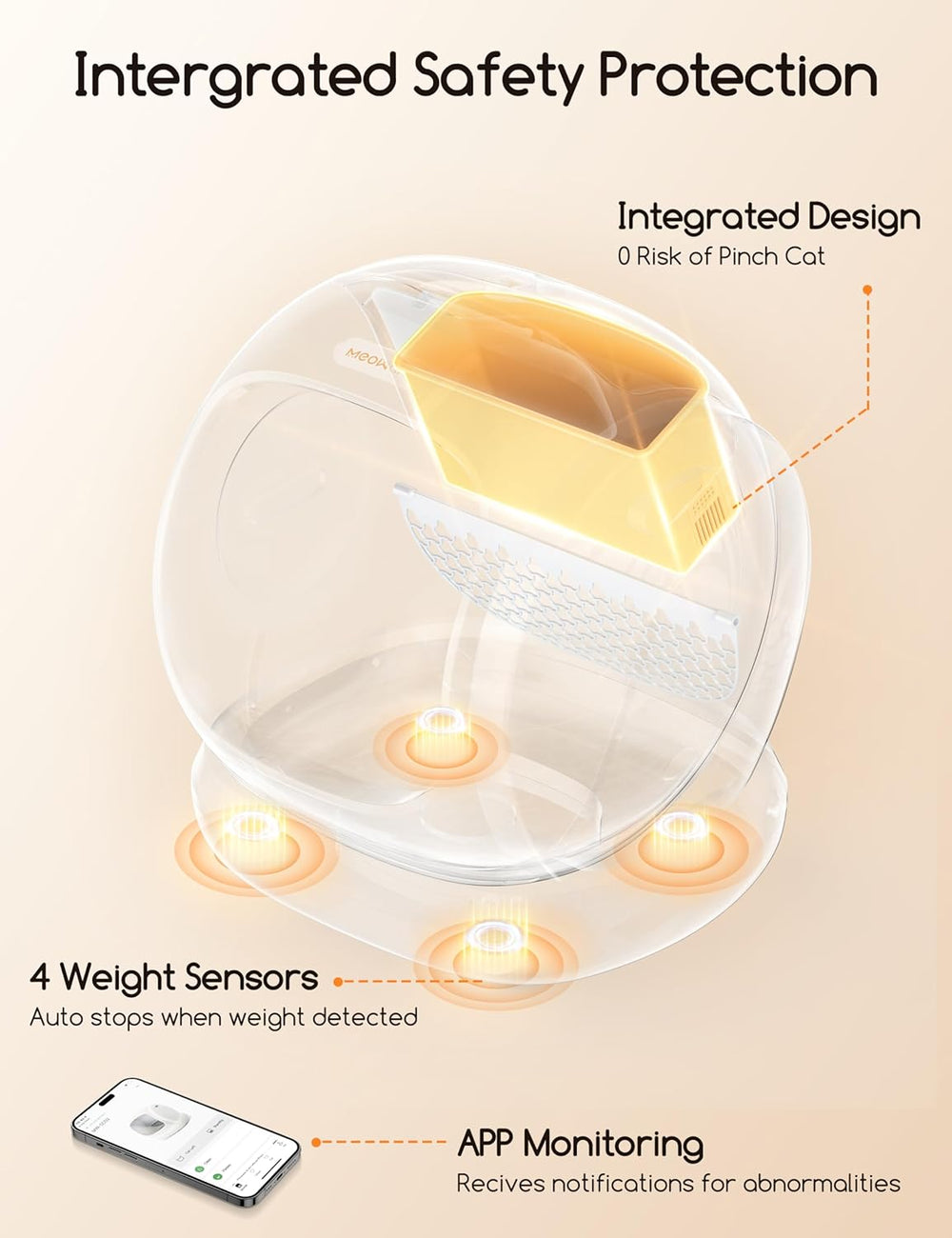 Your cat comes first. The unit features integrated anti-pinch protection and nine precision sensors that detect any movement. The cleaning cycle immediately stops or pauses as soon as a cat approaches, reliably preventing accidents.